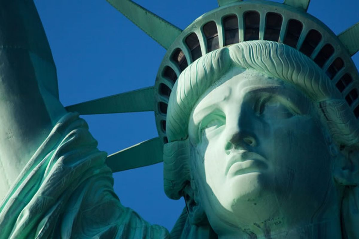 The huge copper statue sits on Liberty Island at the entrance to New York Harbor.