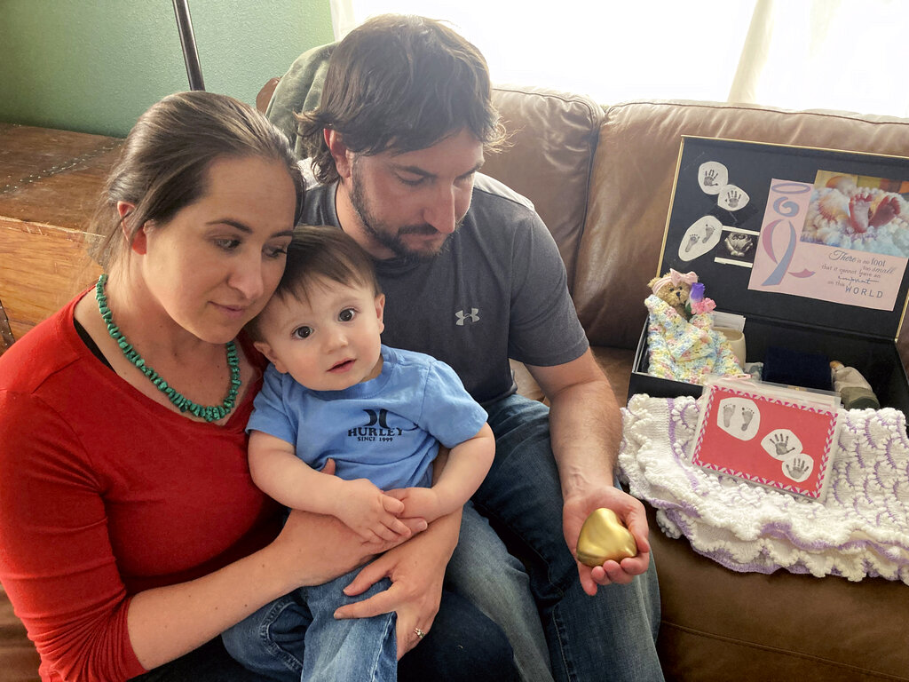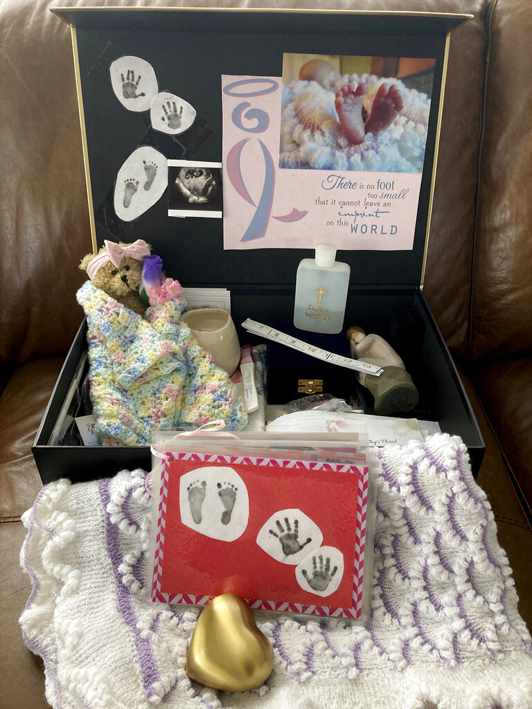 At the Denver hospital, Little Walker and her husband, Ian, got to hold their daughter, whom they’d named Riana, after she died. They maintain her memory in a box with items including her ashes in heart-shaped container, prints of her tiny hands and feet and a baby blanket.