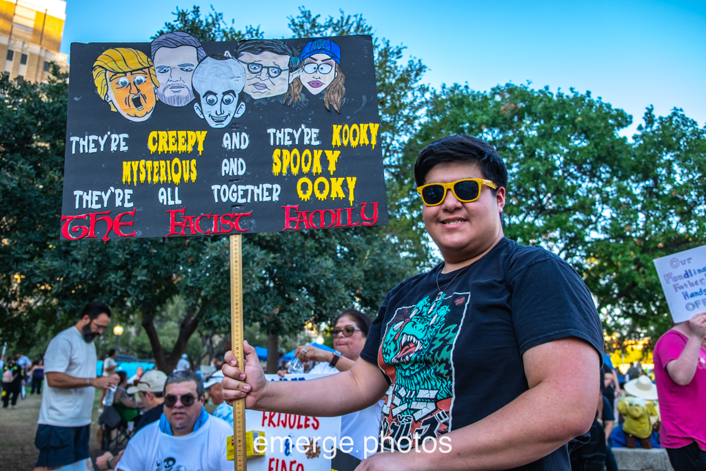 “Today I stand here with the ghosts of my grandfathers at my back. Brave men in the Army, in the Army Air Corps, who fought fascism in World War II,” said a woman who introduced herself as Kate, a U.S. veteran, and a member of Protect and Defend, a San Antonio-based veterans organization.