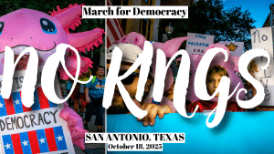 Roughly 10,000 area residents marched through downtown San Antonio on Saturday to take part in the nation-wide ‘No Kings’ day of action and decry the rapid descent of the world’s longest standing modern democracy into authoritarianism. In Texas, they were joined by an estimated 20,000 marchers in Austin, 15,000 in Houston, and thousands more at dozens of marches and rallies across the state.