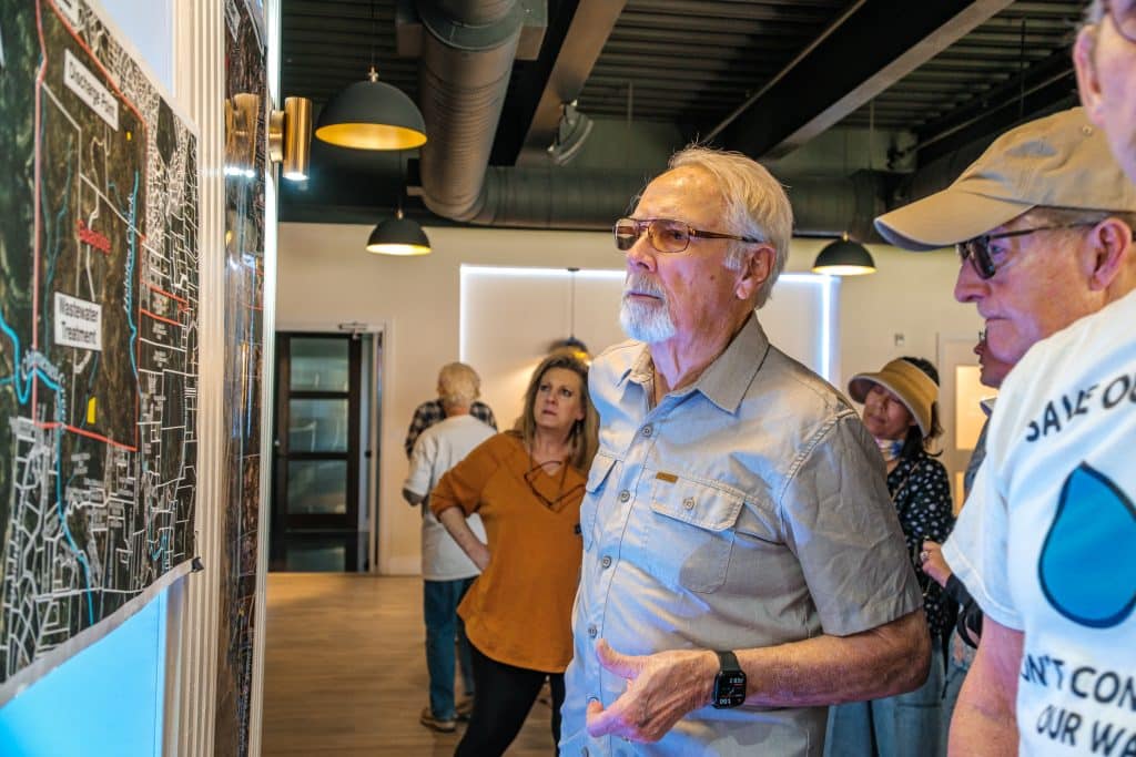 Studying maps of the development and protesting the potential contamination of area groundwater back in February 2025, including a sign outside Grey Forest City Hall reading: ‘Just Say No to Medicines In Your Drinking Water. Join Us.’ Images: Greg Harman