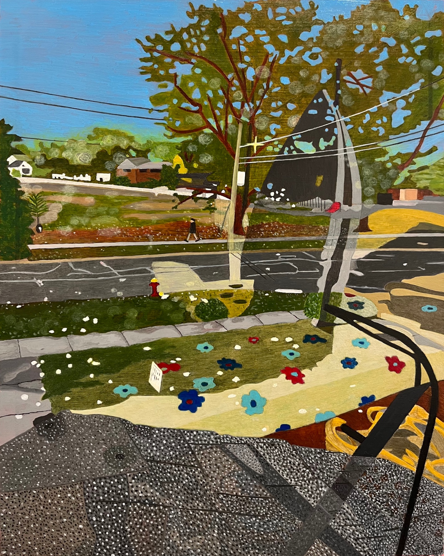 “This ongoing series of inside/outside paintings has developed through the use of imagery drawn from the “everyday.” These paintings offer a merged inside/outside perspective that I began to explore during the pandemic: looking out through windows while sequestered at home, observing the outside world in relation to myself – discovering images reflected and reflecting. These paintings examine the intricate layers of daily life’s architecture, capturing the intersection of built environments and nature. Each painting offers an inside/outside perspective, delving into spatial depth and detail within singular moments.
