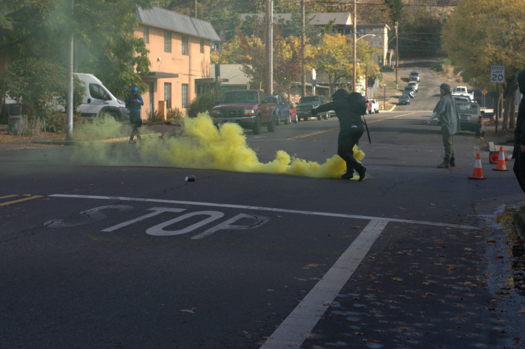 It was reminiscent of the 2020 Black Lives Matter-related protests in Portland and Eugene. Left-wing anti-fascists began to rush to the front with umbrellas and tactical gear to protect the rest of the counter-protesters from the assault.