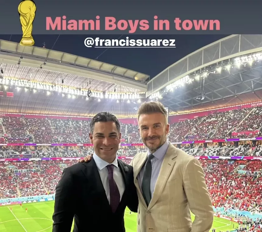 Miami Mayor Francis Suarez was seen chilling with soccer legend David Beckham, co-owner of Major League Soccer team Inter Miami, at the France-Morocco World Cup semifinal match in Qatar on Wednesday. On Instagram, Beckham posted a photo of himself and Suarez (whom he tagged), the pair dressed to the nines with the Al Bayt Stadium stands in the background beneath the caption, “Miami Boys in town.”…