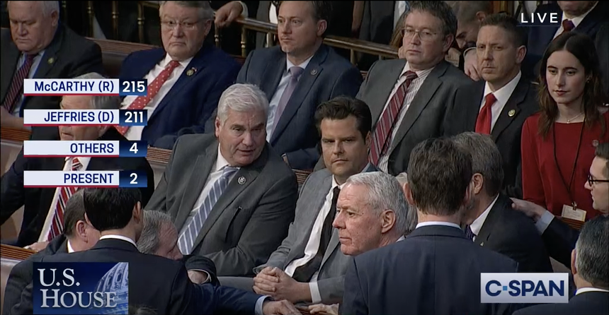 It was the end of a chaotic week in Congress, and tensions were flaring when Kevin McCarthy trekked across the House floor to confront Florida Rep. Matt Gaetz, whose “present” vote had just contributed to McCarthy losing his 14th bid in four days for Speaker of the U.S. House of Representatives. McCarthy posted up to have a word with Gaetz as a crowd gathered around the aisle to watch the exchange…