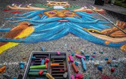 Each sponsor “purchased” a sidewalk square or two and found an artist willing to create an original pastel-chalk artwork on that square. The plaza was closed to vehicle traffic and the artists were surrounded by the usual farmers market vendors on the streets. Live music played in the center of the plaza as the crowd of art lovers wandered the plaza for hours on Saturday and many others visited on Sunday to check out the very colorful but very temporary works.