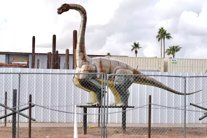 The sculptures appeared without warning — massive metal dinosaurs on platforms. They stand behind fencing that blocks off the sidewalk along Ninth Avenue between Madison and Jackson streets…
