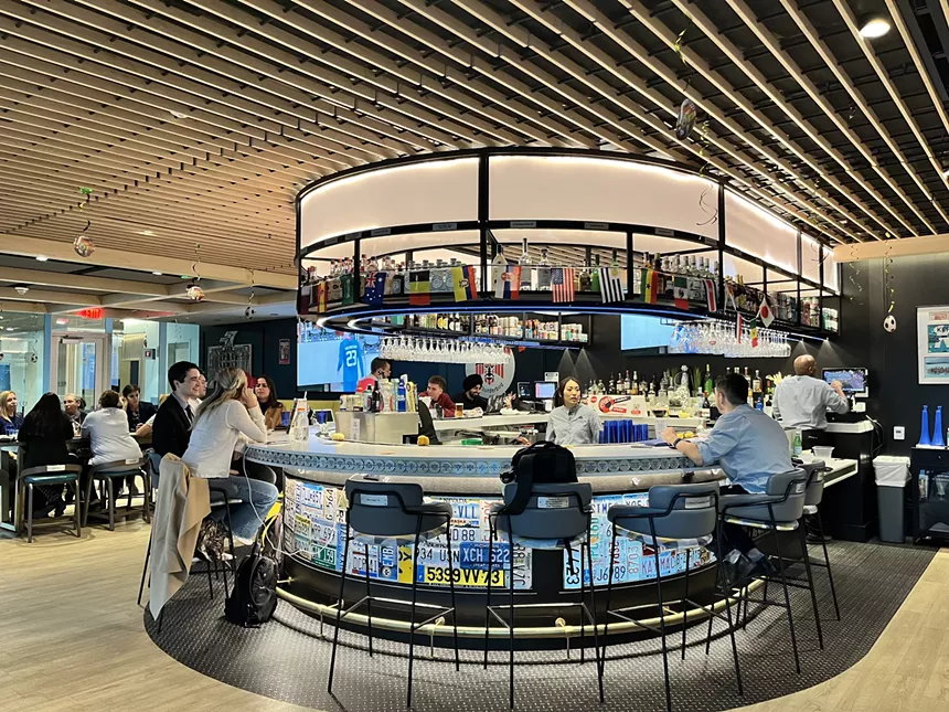 There’s no signage in front of the building or in the lobby, no recommendation to take the elevator to the fifth floor or to turn left once the doors open, and follow the sounds of laughter, music, and lively conversation. But for those in the know, this path culminates in a contemporary space flaunting vibrant lighting, high tops and long dining tables, shuffleboard, a number of flatscreens showing sports, a horseshoe-shaped bar in the center, and a rooftop lounge that showcases skyline and sunset views…