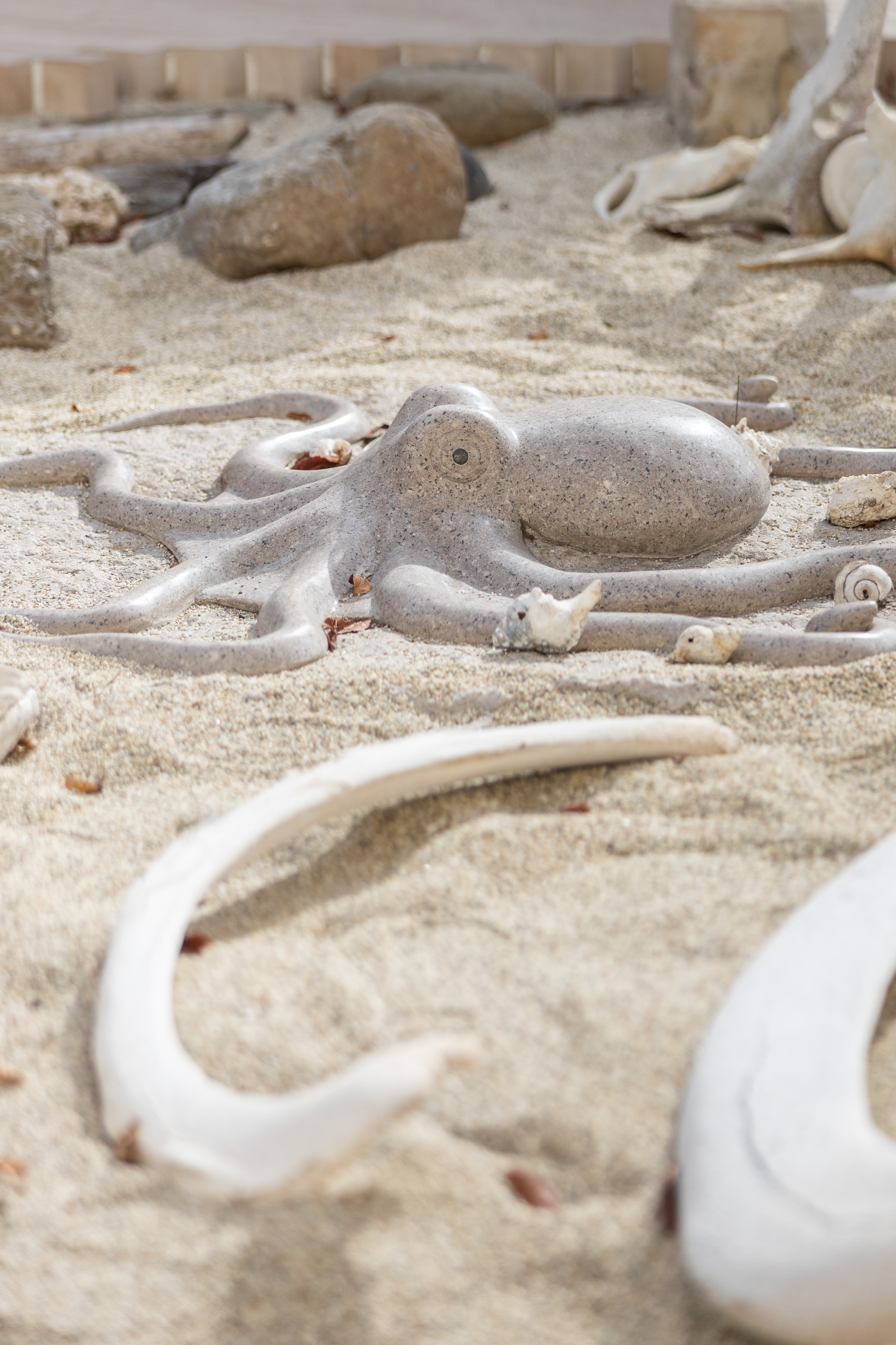 [Click to enlarge] Highlights of the outdoor patio include, from left, sculptures of an octopus and other island critters, to-scale metal benches in the shape of each island, and a statue of Justinian Caire, who owned Santa Cruz Island in the late 1800s.