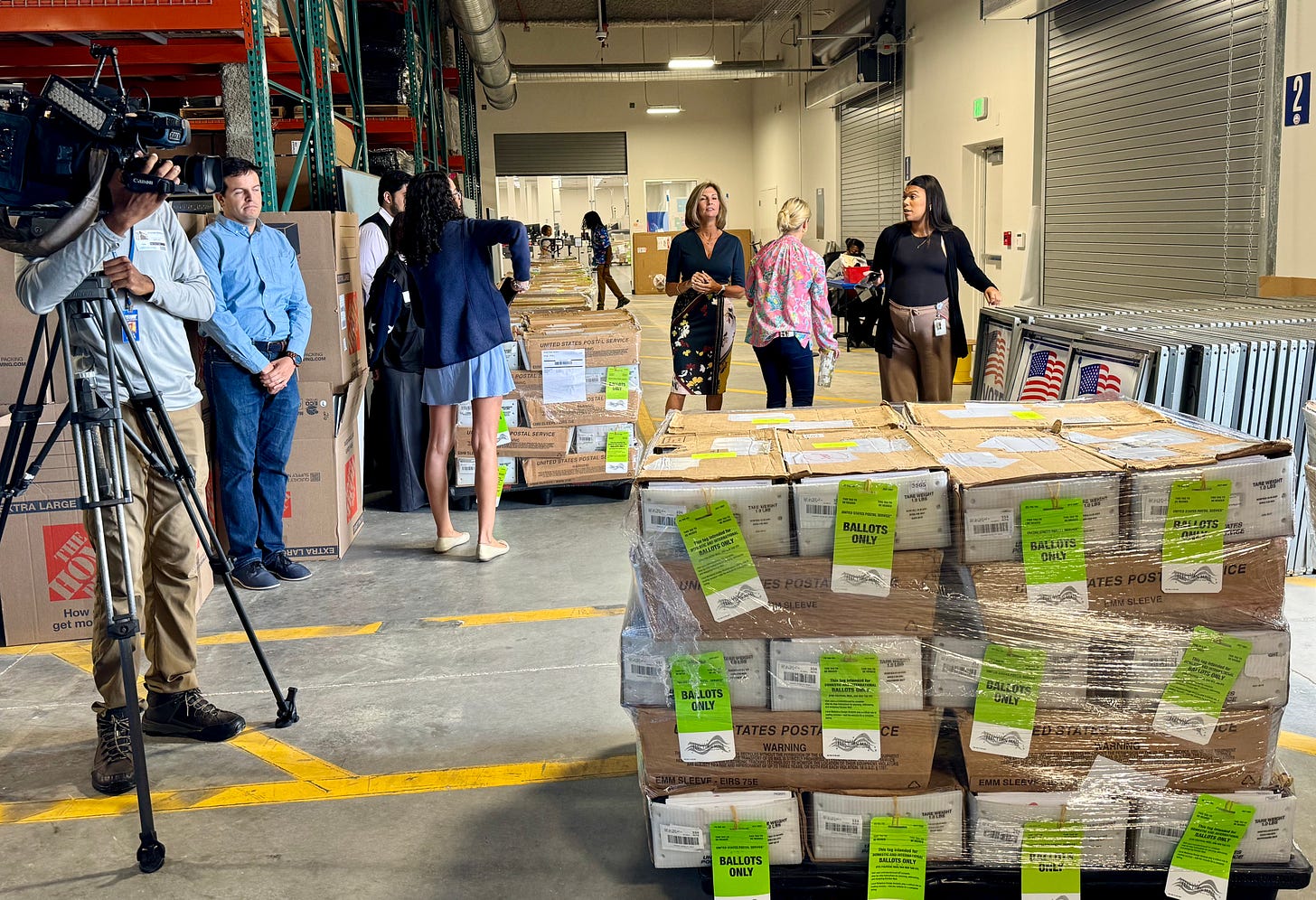 On Friday, election workers rolled out 16 pallets, each containing about 10,000 ballots in postal boxes secured by shrink-wrap, for shipping. The ballots filled a U.S. Postal Service semitrailer-truck.Â