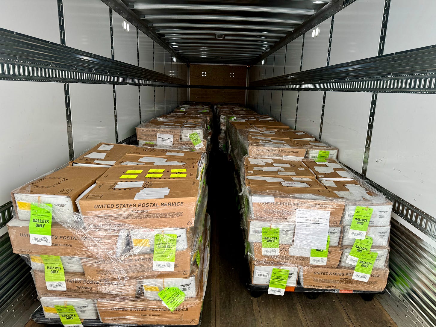 On Friday, election workers rolled out 16 pallets, each containing about 10,000 ballots in postal boxes secured by shrink-wrap, for shipping. The ballots filled a U.S. Postal Service semitrailer-truck.Â