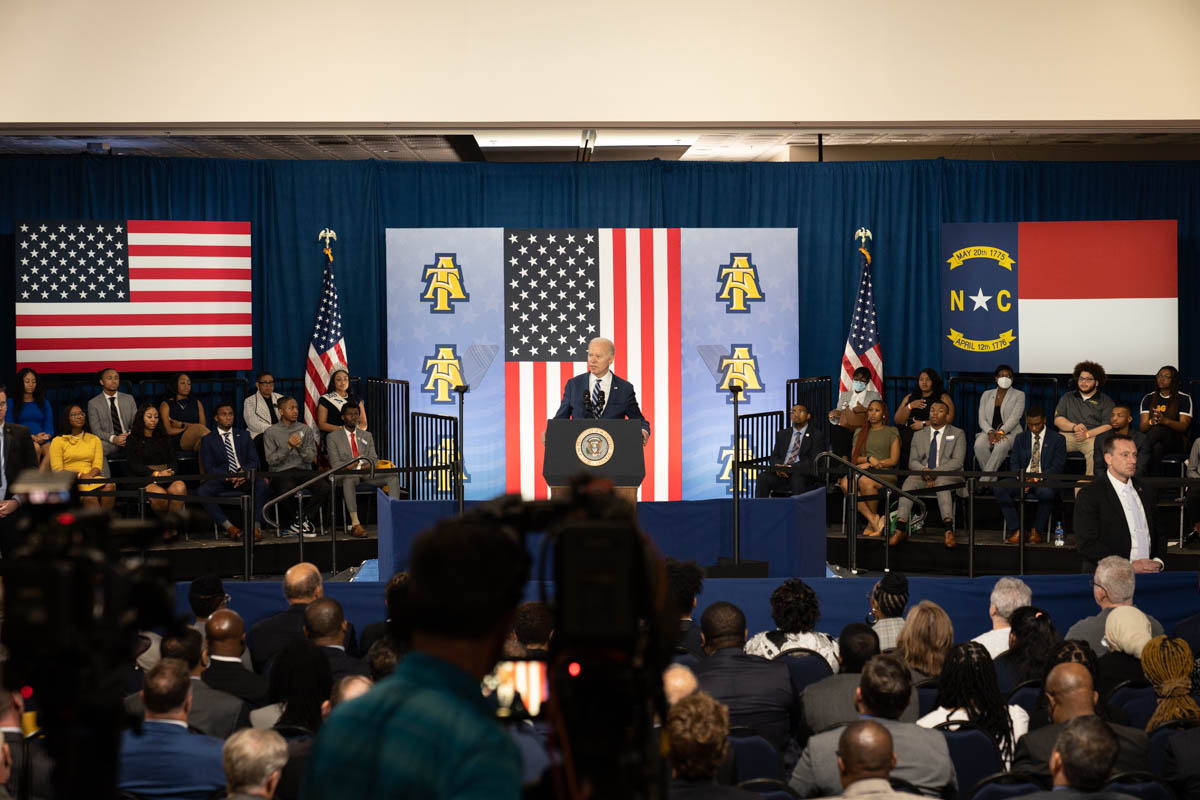 Featured photo: President Joe Biden speaks at NC&AT on April 14, 2022 (photo by Carolyn de Berry)