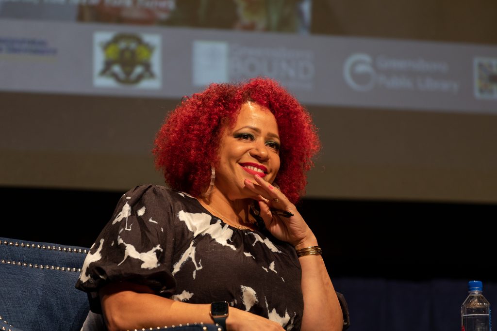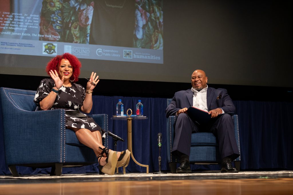 On May 21, Hannah-Jones, joined on stage by moderator Dr. Kim T. Chavis, Director of Title III programs at A&T, began the evening by giving a humorous recount of how her family ended up in Waterloo, Iowa. During the Great Migration — her grandmother and her children, one being Hannah-Jones’ father — took the Illinois Central Railroad north from Mississippi.