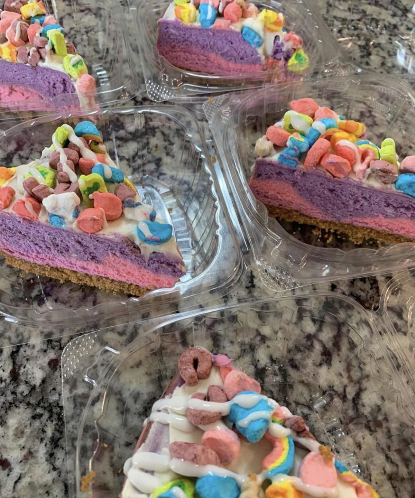 His cheesecake concoctions include Cinnamon Toast Crunch, pink lemonade, Fruity Pebbles, Lucky Charms, his top-selling banana pudding (his wife’s grandmother’s recipe) and seasonal specials like a Little Debbie Christmas Tree cheesecake.