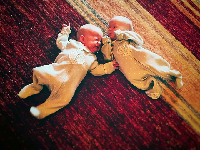 Ava and Nora, our identical twin girls, are splayed out on a blanket in our living room wearing heart-festooned size-0 onesies…