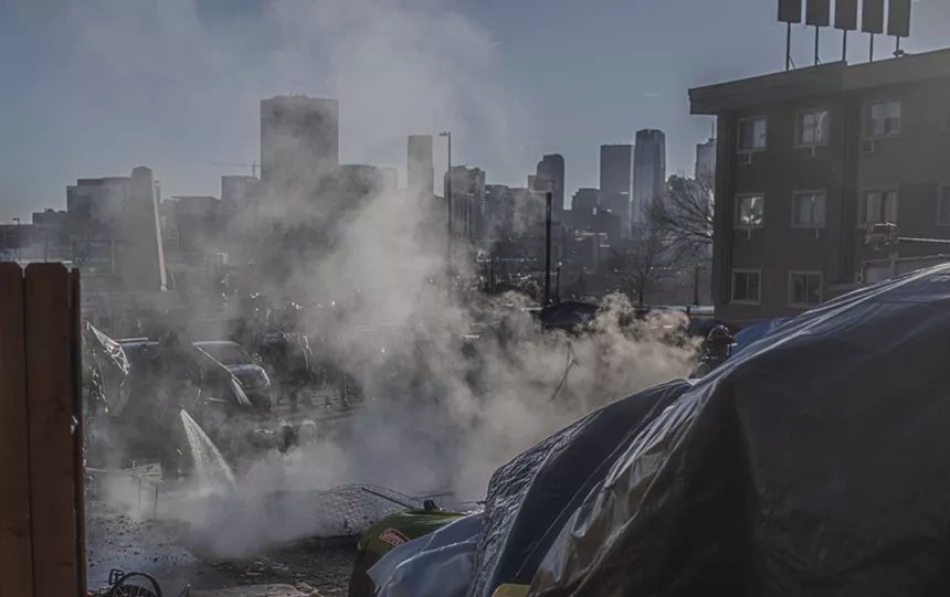 Smoke rose over the Denver skyline after a tent caught fire on January 3 as the city cleared out an encampment of migrants outside the Quality Inn just off Speer Boulevard. Photographer Evan Semón captured the scene, then followed residents of the camp who were bused to intake centers, where they were offered other shelter options…